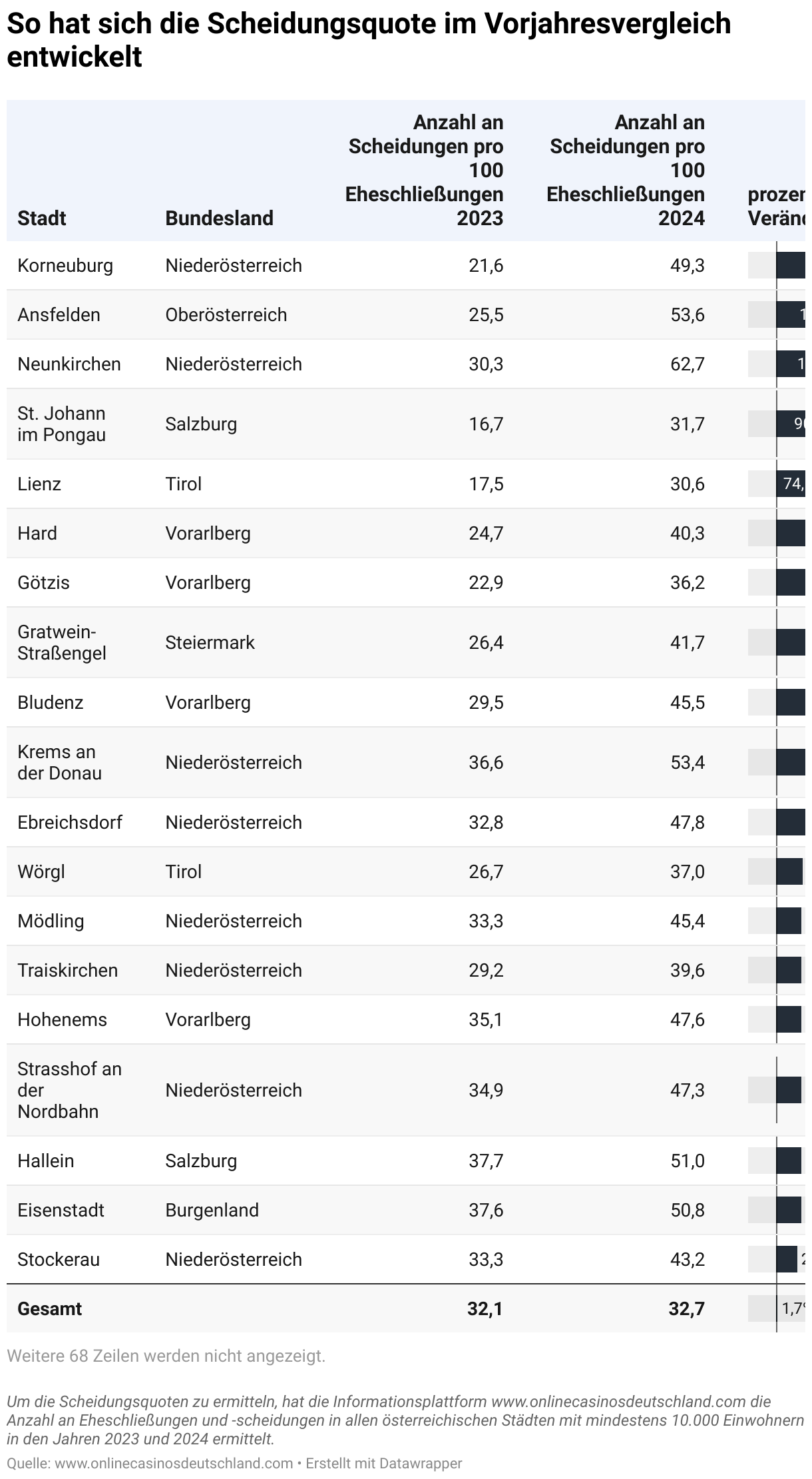 In Lauterach ist die Trennungsquote hingegen rückläufig: Im Vorjahresvergleich ist die Scheidungsquote der Vorarlberger Stadt um 32,8 Prozent zurückgegangen – negativer Spitzenwert im Vergleich. Um 36 Prozent geht die Anzahl an Scheidungen im niederösterreichischen Perchtoldsdorf zurück. Auch in Zwettl-Niederösterreich und Weiz währt das Eheglück mit einer Veränderung von minus 40 bzw. 40,7 Prozent wieder länger als noch 2023, gefolgt von Imst mit einem Rückgang von 41,1 Prozent.