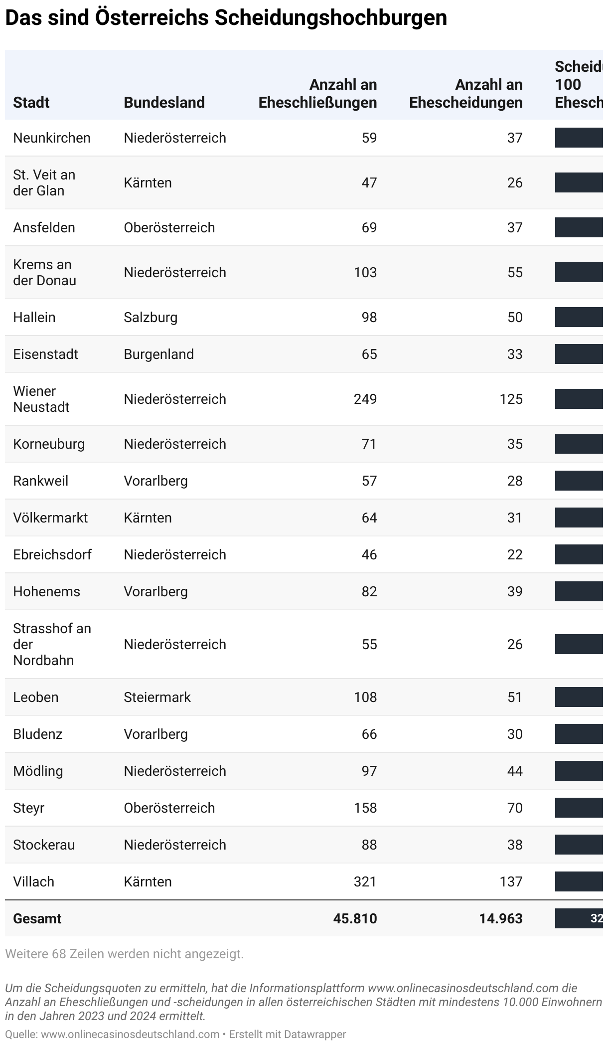 Neben Neunkirchen scheitern auch in St. Veit an der Glan besonders viele Ehen: Mit 55,3 S.p.100.E. sichert sich das Kärntner Örtchen den traurigen Vizetitel als Scheidungshauptstadt. Dahinter reihen sich Ansfelden und Krems an der Donau ein: Im Schnitt werden 53,6 bzw. 53,4 Paare pro 100 Eheschließungen in den beiden Orten wieder geschieden. Zum Vergleich: Im nationalen Schnitt liegt die Quote bei 32,7 Scheidungen pro 100 Eheschließungen, womit die Scheidungsrate im Vorjahresvergleich etwas angestiegen ist (2023: 32,1 S.p.100.E.).