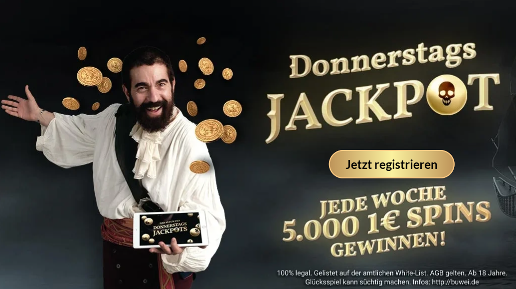 Der Donnerstags-Jackpot ist ein attraktives Angebot für alle Spieler. Auch die erste Kaperfahrt wird bei JackpotPiraten belohnt, wie unser ausführlicher JackpotPiraten Test zeigt.
