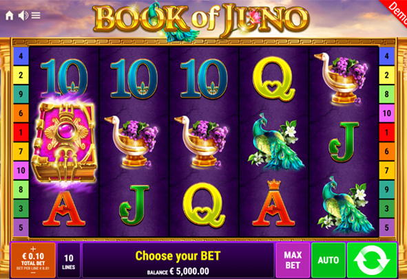 Book of Juno ist ein Fruit Online Spielautomat von Gamomat mit klassischen Thema. Der Slot hat eine 96,14 % Auszahlungsquote, 10 Gewinnlinien auf 5 Walzen sowie Free Spins Runden, Card Gamble Feature und Risikoleiter