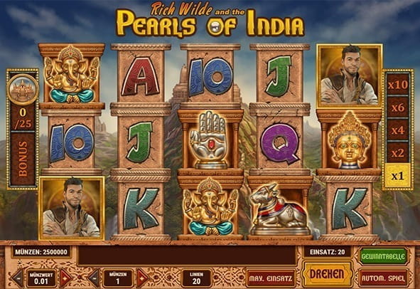 Pearls of India ist ein Video Slot mit zunächst klassischer Aufmachung und dreht sich um den Forscher Rich Wilde, der bereits bei dem angesagten Automatenspiel Book of Dead den Hauptcharakter spielt. So wird auf fünf Walzen und drei Reihen gespielt. Gewonnen wird auf 20 festen Gewinnlinien, die immer von links nach rechts auszahlen. Der Held des Spiels fungiert als Joker und ersetzt alle anderen Symbole bis auf Scatter und Bonussymbol. Drei Scatter Symbole auf den Walzen belohnen euch mit 10 Freispielen, während derer ihr einen zusätzlichen Joker bekommt. Es gilt diese Joker zu sammeln um bis zu das 50-fache eures Einsatzes zu ergattern. Die anderen Symbole sind indische Gottheiten und Heiligtümer sowie die Kartenspielsymbole Ass, König, Dame, Bube und die 10. Bekommt ihr eine Gewinnkombination in der Bonusrunde auf die Walzen, verschwindet sie und macht Platz für nachrückende Symbole. Gleichzeitig steigt ein Multiplikator am rechten Bildschirmrand, der sich pro Gewinnkombination pro Runde auf bis zu x10 erhöhen kann! Das ist ein ausgesprochen gutes Feature, dass die Basisrunde wirklich aufwertet. Ihr könnt euren Gewinn dank der Risikofunktion zusätzlich vervielfältigen. Dazu müsst ihr die Farbe oder das Symbol einer zu ziehenden Karte richtig erraten. Schafft ihr dies, könnt ihr den erbeuteten Gewinn in gleicher Art vervielfältigen. Doch Vorsicht, die Risikofunktion funktioniert nach dem Alles-oder-Nichts-Prinzip. Abgerundet werden die Funktionen durch die frei auswählbare Anzahl eingesetzter Münzen pro Runde sowie deren Wert und einer individuell einstellbaren Autospielfunktion.